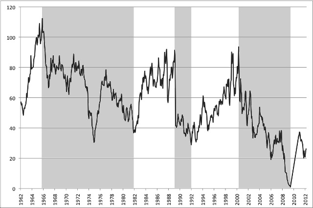 Periods of decline in investor confidence are shown in grey. Source: NYSE 2012.