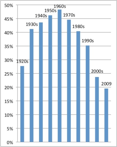 Figure 4 (left): GM’s share of the US automobile market, from the 1920s to 2009, showing a peak in the 1960s. Source: Regassa and Ahmadian (2007).