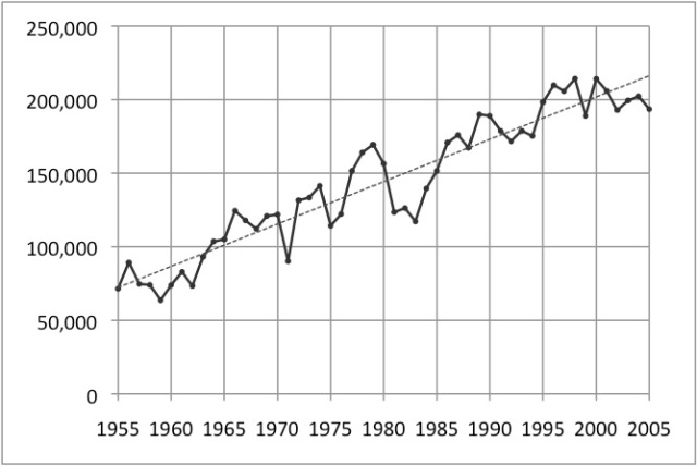 Figure 5 (right): GM real global revenues, 1955-2005, shown in millions of (real) dollars. The dotted line shows a steady growth trend until 2000. Nevertheless, the periods of 1967-1971 and 1974-1975 saw declining revenues. Source: CNNMoney (2012).