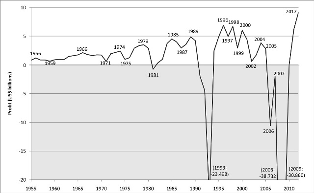 Figure 6: GM global profits, 1955-2012; stability of profits peaked in 1966. As a consequence of its own longstanding financial instability, exacerbated by the wider automotive industry crisis of 2008-2009, in 2009 GM filed for Chapter 11 bankruptcy and became reorganised under favourable terms. Source: CNNMoney (2012).
