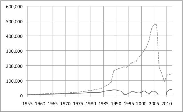 Figure 7: GM’s assets, 1955-2012, shown in millions of US dollars; stockholder capital (solid line) is shown in relation to total assets (dotted line). The financialisation of GM’s business is visible in the neoliberal-era mushrooming of GM’s dependence on ‘non-traditional’ (non-stockholder-based) forms of capital.