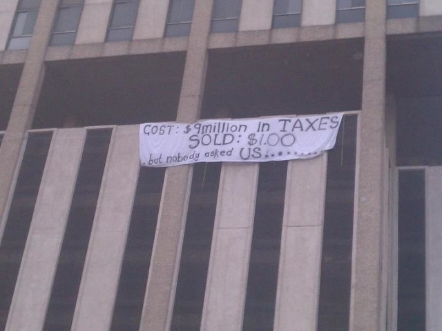 Figure 8: A banner hangs from the Flint Towers building protesting the terms of its sale to Upscale.
