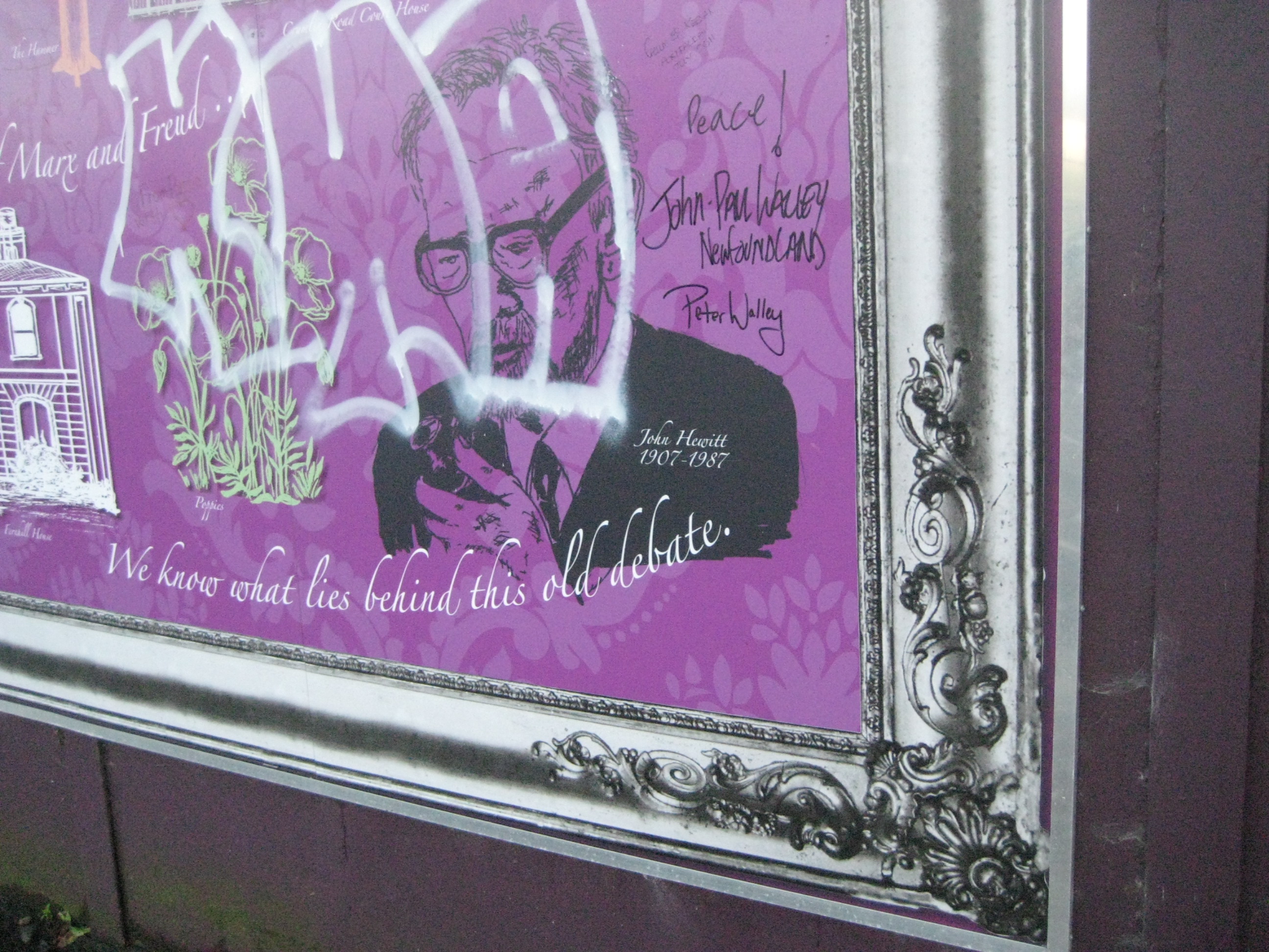 This article explores the representational implications of an ongoing project along Belfast’s main peace wall to transform the loyalist side of the barrier into an outdoor art gallery. Drawing in part on the interplay between social production and social construction (Low 2000) in the analysis of public space, the wall’s art is assessed as one means through which both elites and ordinary people inscribe meaning in the landscape. Particular attention is focused on a recently added mural, created as part of a European Union-funded initiative to promote ‘shared cultural space’, and the identity this promotes for the local population. Using ethnographic data gathered through participant observation as well as interviews with policymakers, artists, community stakeholders and residents, I suggest that while the wall’s art is not necessarily received or experienced by the Protestant community in the manner it is intended, it broadly serves as a touchstone by which narratives of conflict and communal ties are activated, and the neighbourhood’s evolving identity as an element in a new tourist-oriented economy is brought to the fore.